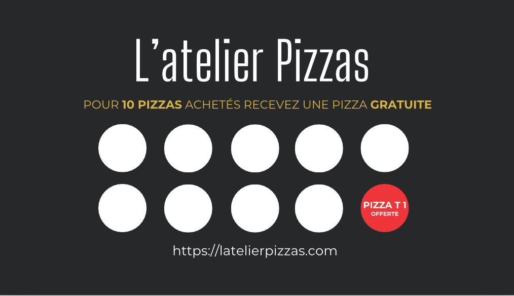 Chez L'Atelier Pizzas, nous souhaitons remercier nos clients fidèles ! Pour chaque commande, vous cumulez des tampons sur votre carte de fidélité. Une fois votre carte complétée avec 10 tampons, la 11ème pizza est offerte !