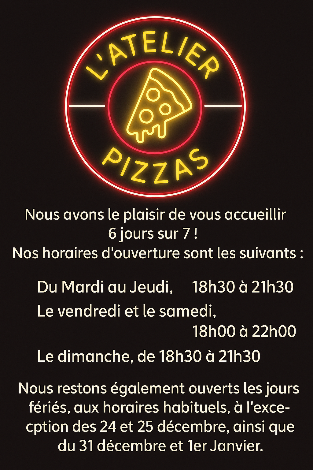 Nous restons également ouverts les jours fériés, aux horaires habituels, à l'exception des 24 et 25 décembre, ainsi que du 31 décembre et 1er Janvier.